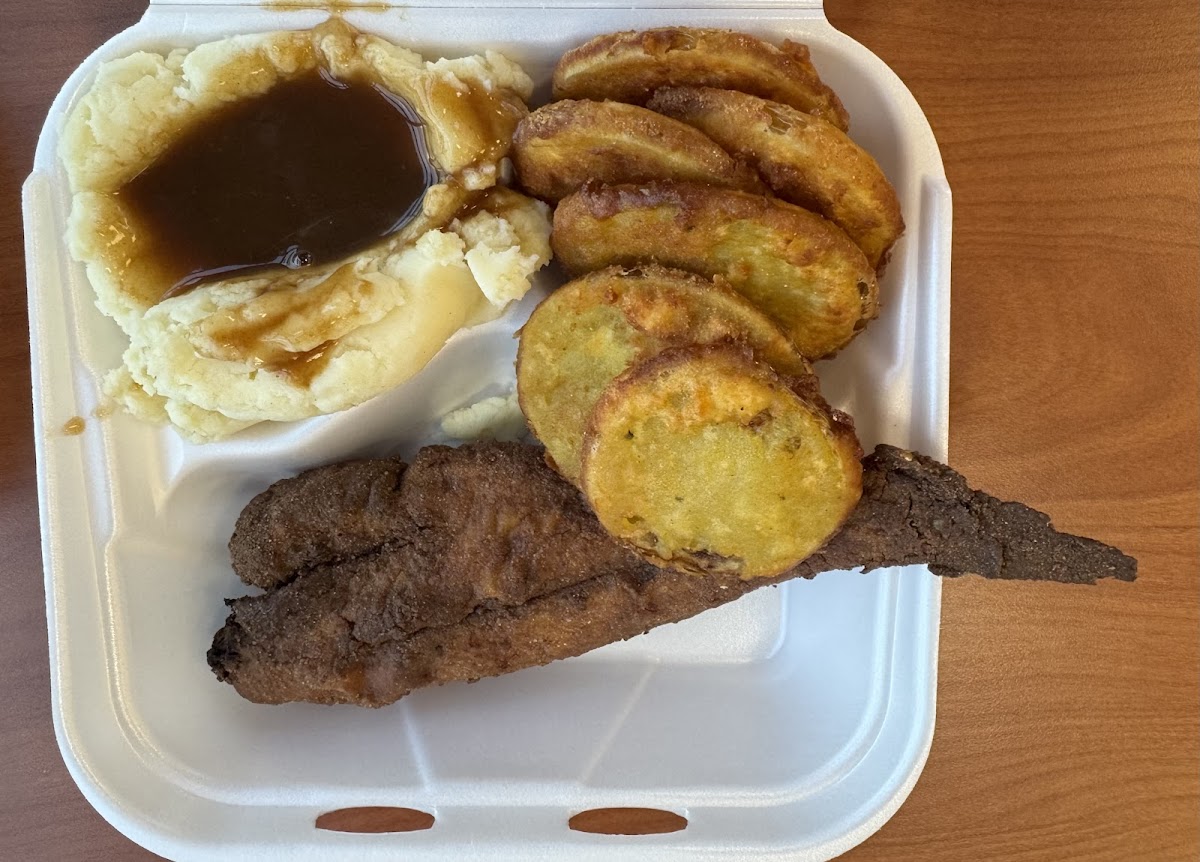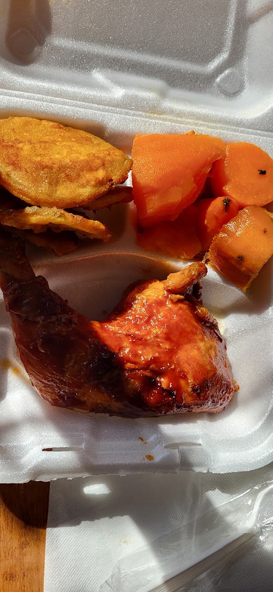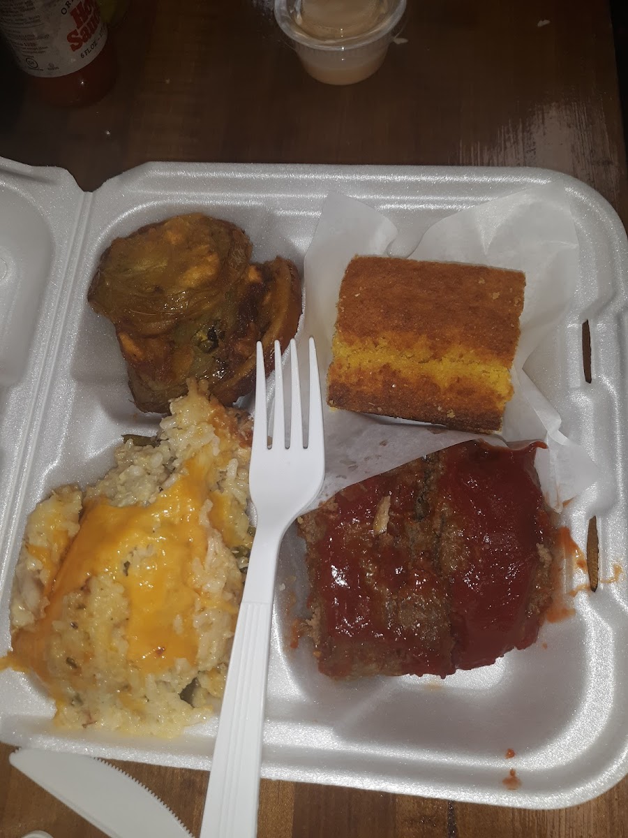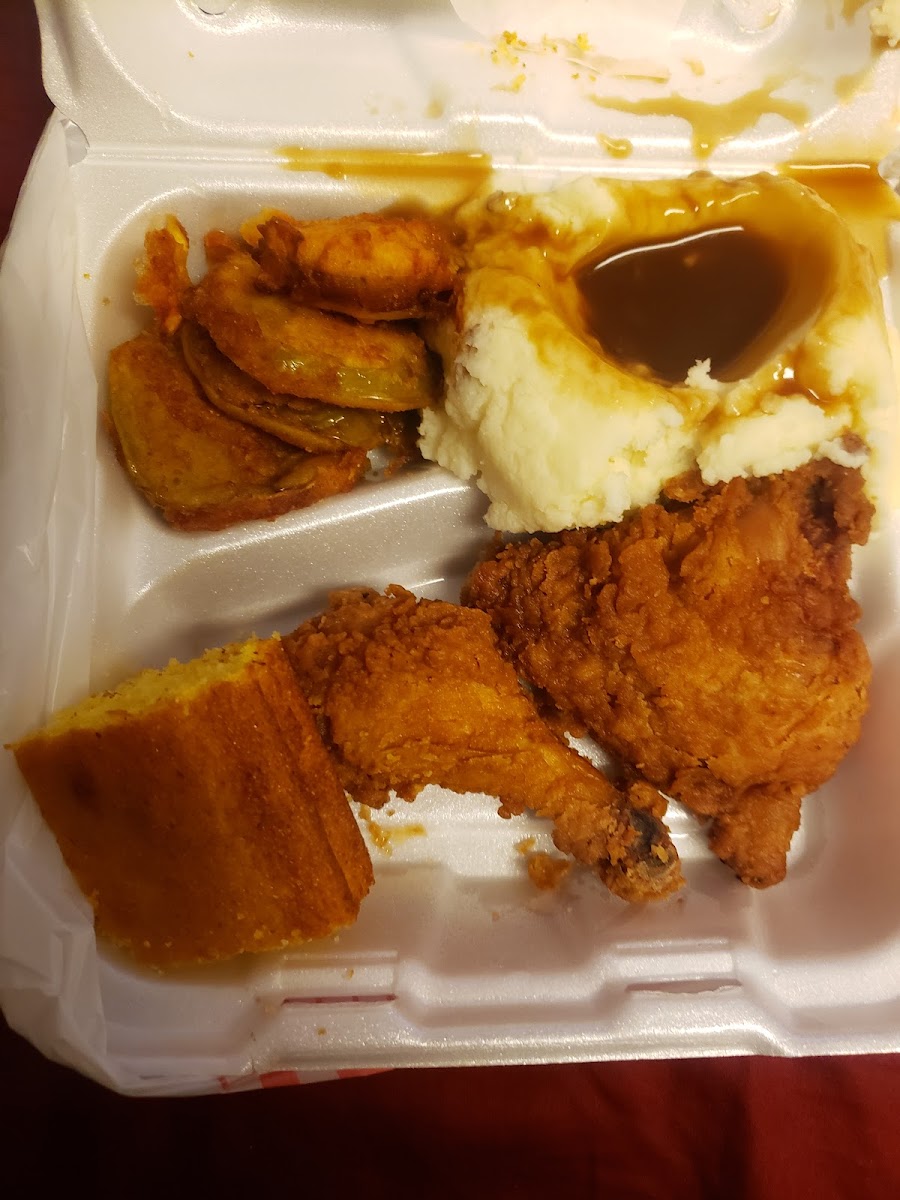 $10 for a plate with 2 full sized meat entrees is amazing. I picked the fried chicken (2 full pieces) and giant turkey wing. They also offered extra fried green tomatoes in place of the bread. Every single part of this meal was awesome. Chicken was fresh, hot and crispy, turkey wing was extremely tender.