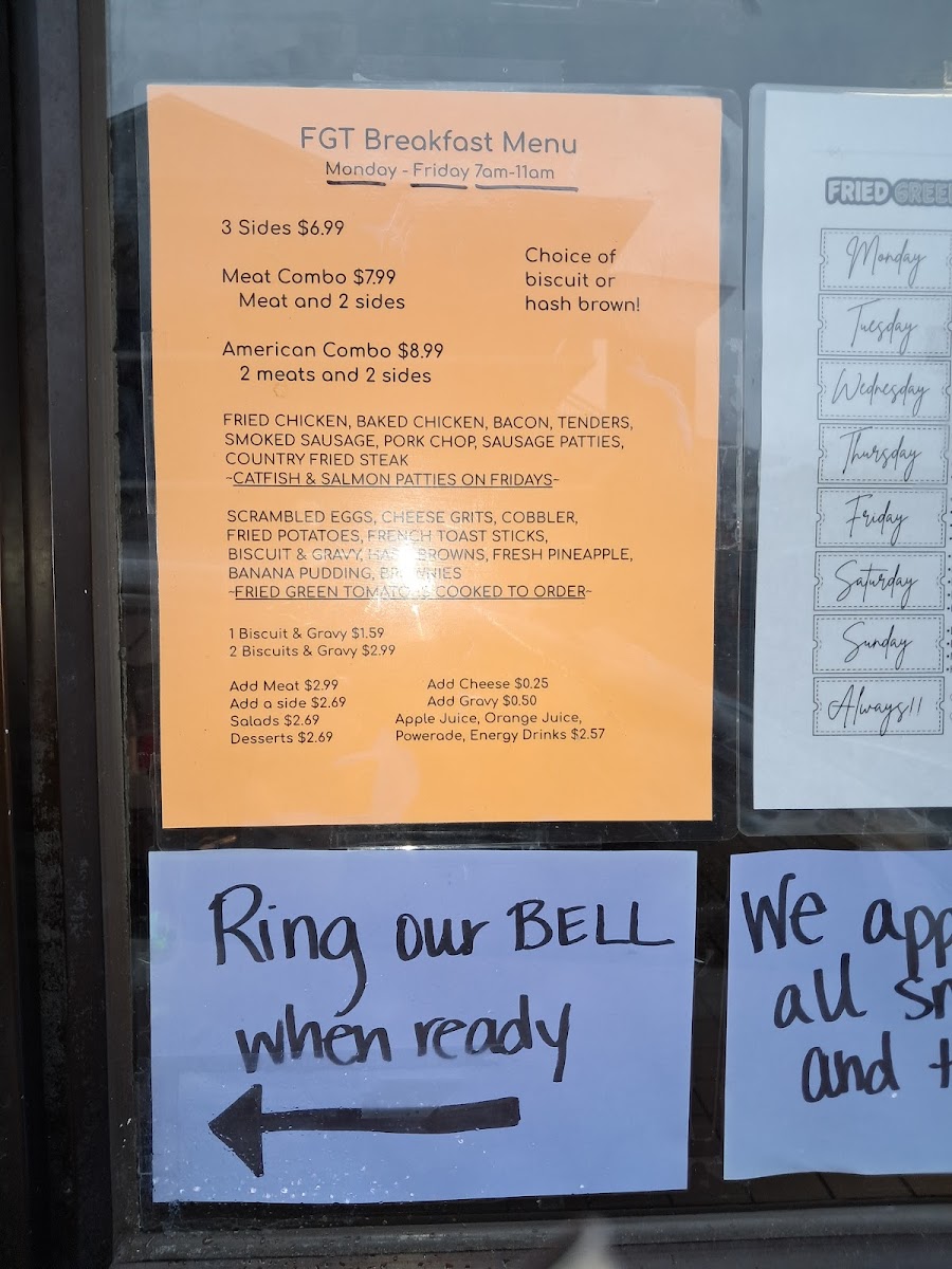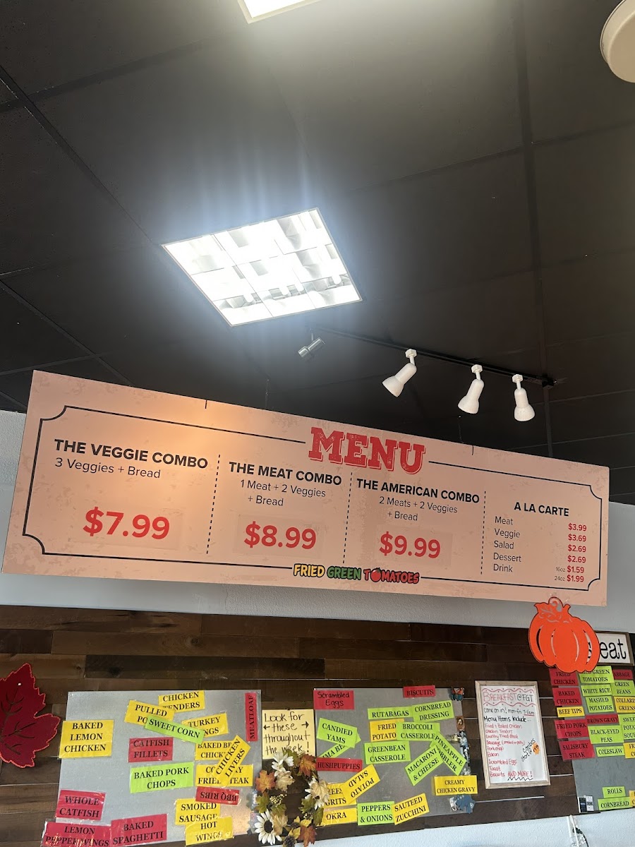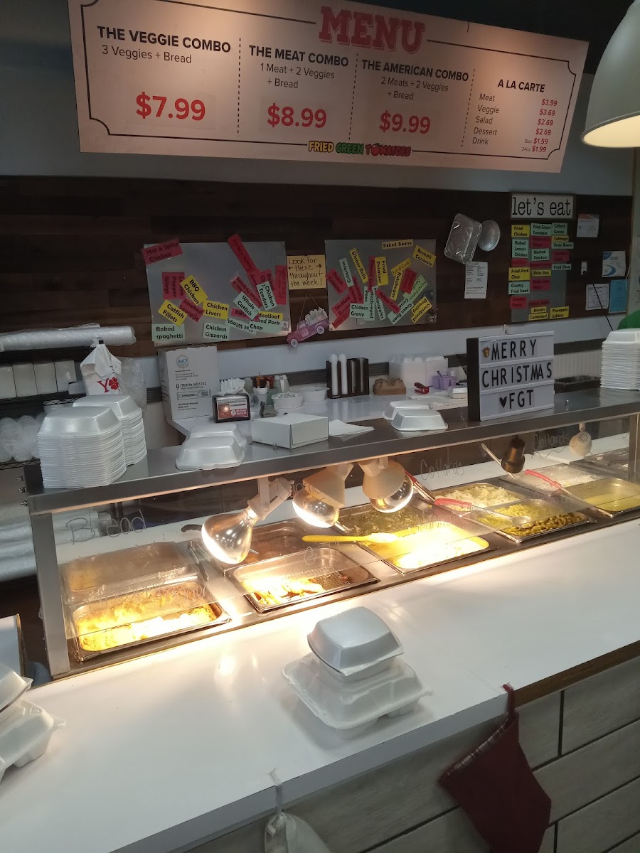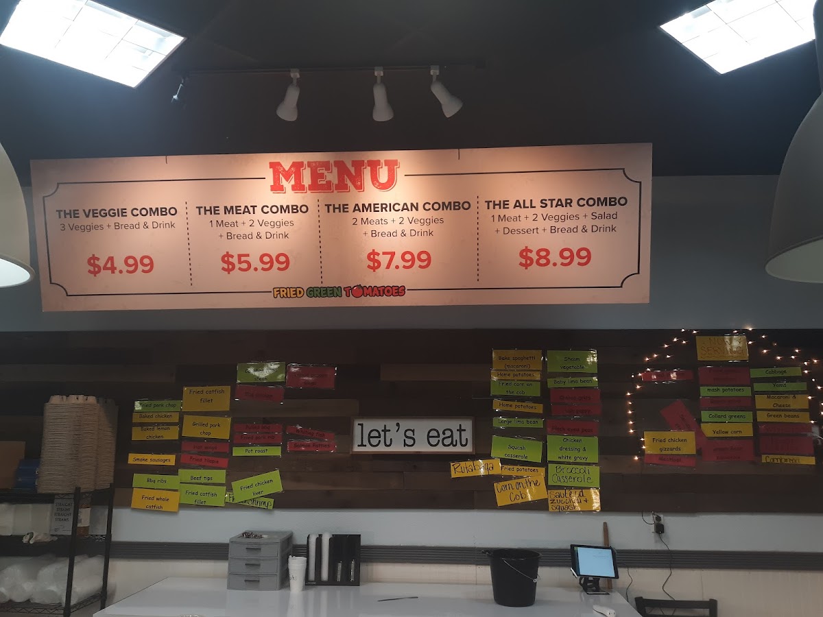 You’ll find popular Southern staples like baked chicken, fried chicken packs, and meatloaf, alongside beloved sides such as cornbread, candied yams, fresh salads, and the signature fried green tomatoes. The menu also features convenient combo options that let you mix and match proteins and sides, perfect for those who enjoy variety or a filling, well-rounded meal.